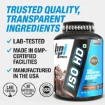 Isolate proteins are a sought-after nutrient source because the whey protein powder is put through an additional process to further isolate the protein parts from the fat and lactose (sugar) found in dairy. BPIs ISO-HD is globally recognized as one of the top choices in the ISO market.