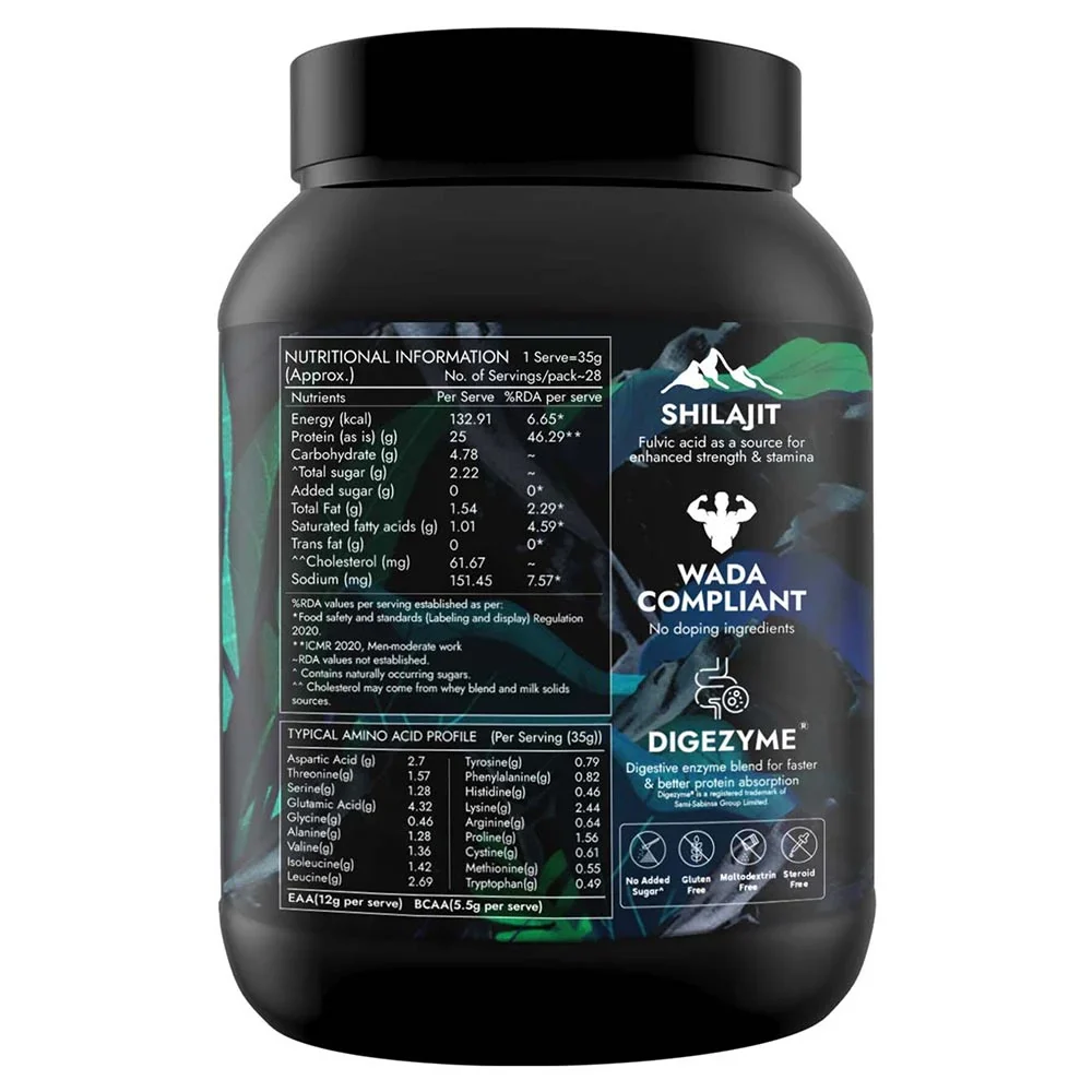 WHEY ISOLATE & CONCENTRATE BLEND derived from Dadhi Mastu Extract (Butter Milk) 30.5g, Pomegranate Extract (Punica granatum) Fr. 100mg, Gokshura Extract (Tribulus terrestris) Fr. 45mg, Kapikacchu Extract (Mucuna pruriens) Sd. 45mg, Black Musli Extract (Curculigo orchioides) Rt. 45mg, Bala Extract (Sida cordifolia) Rt. 25mg, Vidarikand Extract (Pueraria tuberosa) Rt. 25mg, Kutaki Extract (Picrorhiza kurroa) Rz., Lf., Bk. 25mg, Mariccha Extract (Piper nigrum) Fr. 10mg, Minerals: Resin of: Shilajit (Asphaltum punjabianum) Exd. 250mg, Excipients: Xanthan Gum Q.S., Carragenan Q.S., Guar Gum Q.S., Sucralose Q.S., Digezyme Q.S., Probiotic Blend Q.S., Cocoa Powder Q.S., Salt, Cookies Crumbs Q.S., Milk Solids Q.S. Flavour: Cookies and Cream Flavour Q.S. CONTAINS SUCRALOSE. ALLERGEN INFORMATION: Contains Milk