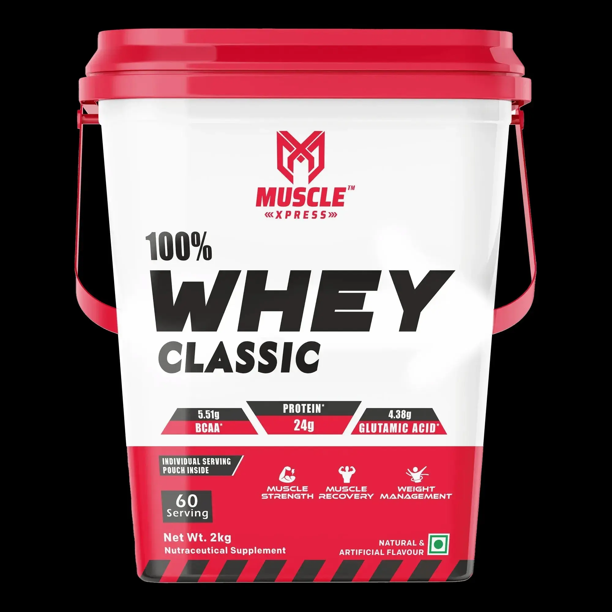One of their offerings is Muscle Xpress Whey Classic (e.g. 2 kg, chocolate flavor) marketed as a high-quality whey protein supplement to support muscle recovery and growth.