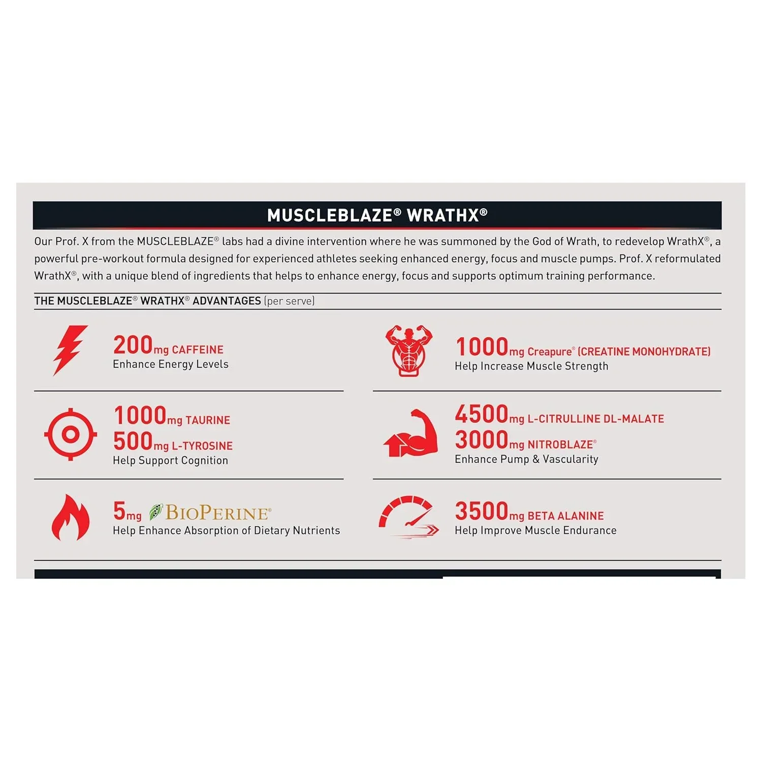 With its reformulated, enhanced formula and intense Fruit Fury flavor, WrathX delivers a brutal surge of energy, focus, and endurance, empowering you to dominate your toughest challenges. Now with a recommended serving of 1 scoop (17g), WrathX Fruit Fury delivers an even more intense pre-workout experience.