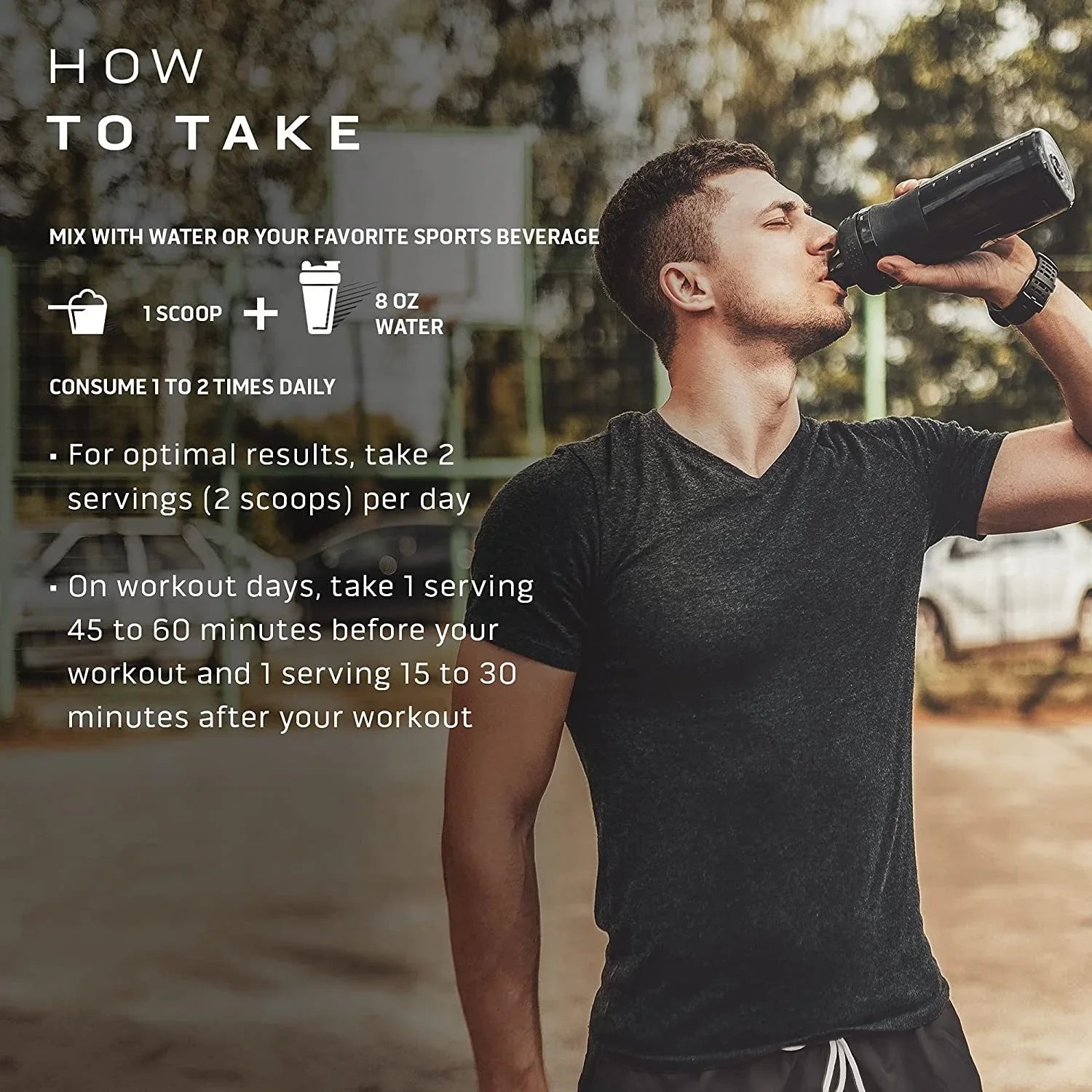 Mix 1 serving (1 scoop) with 8 oz. of water or your favourite sports beverage and consume 1 to 2 times daily. For optimal results, take 2 servings (2 scoops) per day. On workout days, take 1 serving 45 to 60 minutes before your workout and 1 serving 15 to 30 minutes after your workout.