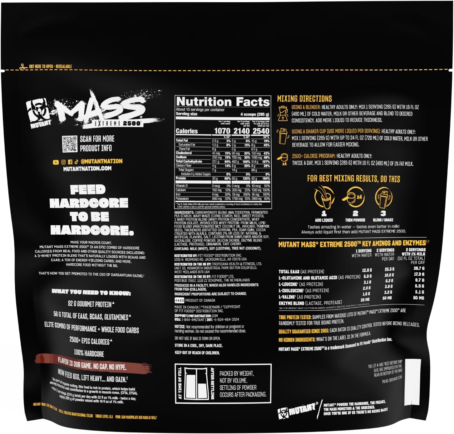 Shake or mix 4 scoops of Mutant Mass with 32 fl. oz. (946mL) of low fat 1% milk. Mixing Mutant Mass with milk tastes better than with water. It delivers 170g of protein and 2,940 calories per day.