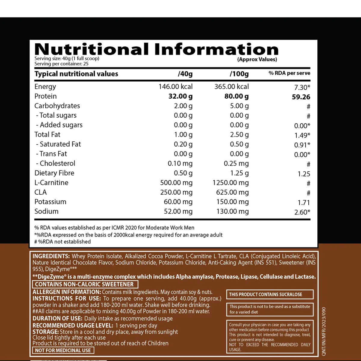 Whey Protein Isolate, Alkalized Cocoa Powder, L-Carnitine L-Tartrate, CLA (Conjugated Linoleic Acid), Nature Identical Chocolate Flavor, Sodium Chloride, Potassium Chloride, Anti Caking Agent (INS 551), Sweetener (INS 955), DigeZyme