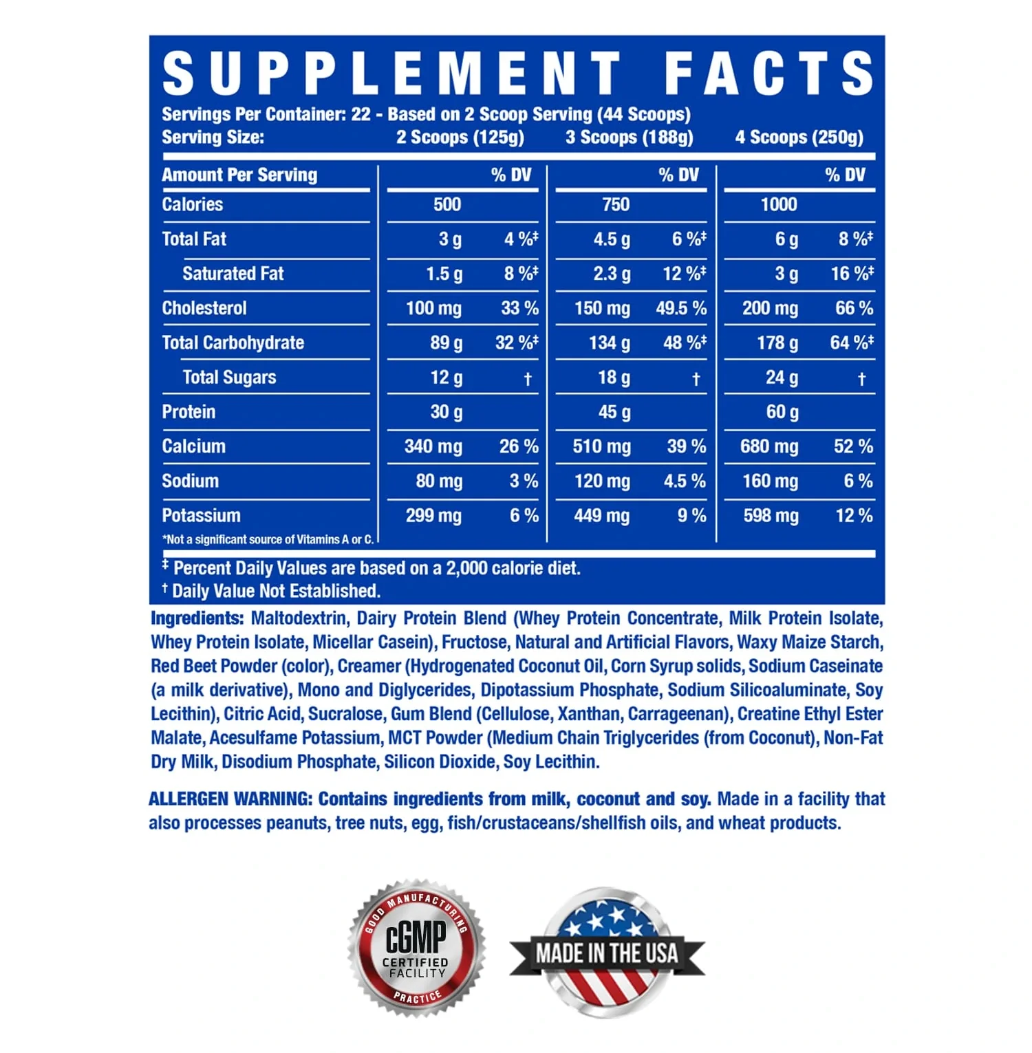 Maltodextrin, Dairy Protein Blend (Whey Protein Concentrate, Milk Protein Isolate, Whey Protein Isolate, Micellar Casein), Fructose, Natural and Artificial Flavors, Waxy Maize Starch, Red Beet Powder (color), Creamer (Hydrogenated Coconut Oil, Corn Syrup solids, Sodium Caseinate (a milk derivative), Mono and Diglycerides, Dipotassium Phosphate, Sodium Silicoaluminate, Soy Lecithin), Citric Acid, Sucralose, Gum Blend (Cellulose, Xanthan, Carrageenan), Creatine Ethyl Ester Malate, Acesulfame Potassium, MCT Powder (Medium Chain Triglycerides (from Coconut), Non-Fat Dry Milk, Disodium Phosphate, Silicon Dioxide, Soy Lecithin.